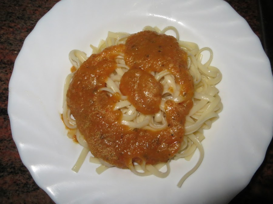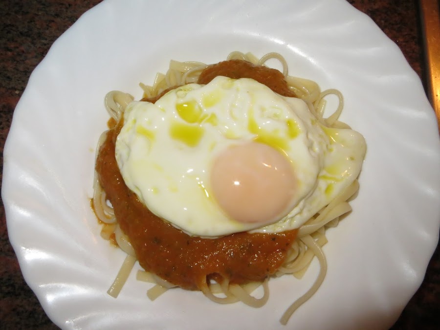 Lo primero que hacemos es cocer la pasta, para ello echamos agua en una cacerola con sal y un par de hojas de laurel y cuando empiece a hervir añadimos la pasta y seguimos las instrucciones del paquete. En mi caso estuvo diez minutos. A continuación, la escurrimos y la echamos en los platos donde vayamos a servirla, le añadimos el tomate frito casero, ya sea caliente o frío como más os guste y en una sartén con bastante aceite freímos los huevos fritos y los ponemos para coronar el plato. También le podéis añadir plátano frito al plato para que se parezca más al arroz a la cubana, aunque como a mí no me gusta no se lo puse.