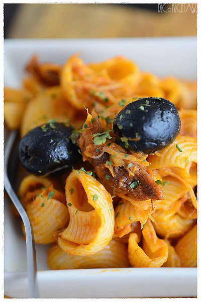 Pochamos la cebolla y el ajo a la que agregamos el tomate maduro picado en cuadraditos y las cayenas. Dejamos cocinar a fuego lento durante unos minutos, y en mi caso, trituro y paso por el chino, pero si la salsa os gusta así no haría falta. Agregamos la pasta cocida junto con las aceitunas, caballa y anchoas y servimos con perejil picado por encima.