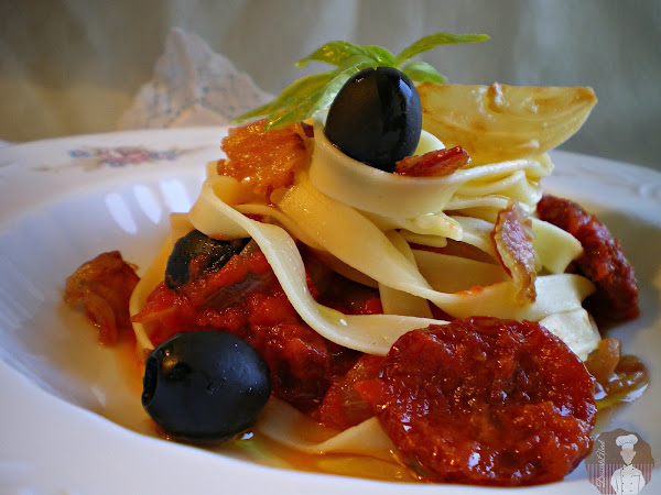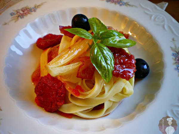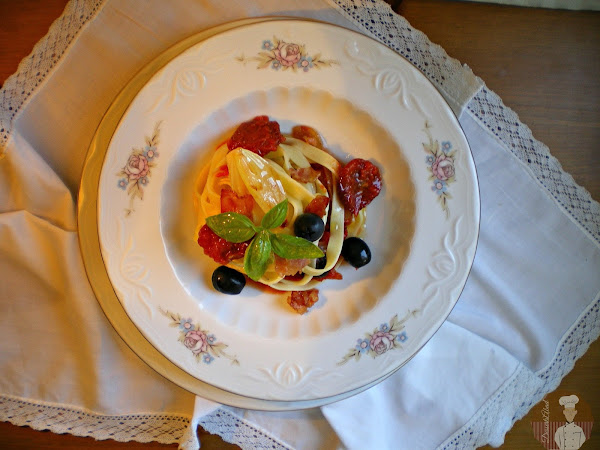 La verdad sea dicha, la receta de pasta que os presento es bastante simple tanto en ingredientes como en su elaboración, sin excesos de ornamentos, aunque todo el conjunto una vez cocinado nos proporciona un plato de pasta muy sabroso gracias a la aportación del beicon frito y con "tropezones" de aceitunas negras y tomates en aceite que están para chuparse los dedos.