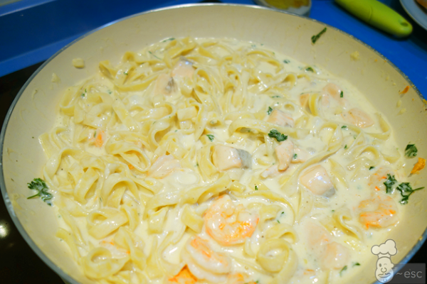 Pasta alfredo con salmón y langostinos minutos antes de servir