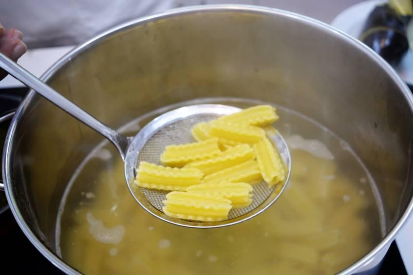 Paso 1 Comenzaremos a preparar esta pasta alla norma, poniendo una cazuela con agua a calentar. Cuando esté hirviendo ponemos un puñado de sal y la pasta para que se cueza nadando a gusto durante el tiempo recomendado por el fabricante. Paso 2 Mientras se calienta el agua y se cuece la pasta, tenemos que ir haciendo el sofrito de la pasta alla Norma. Por un lado tenemos que freír unos bastoncitos de berenjena en abundante aceite de oliva.