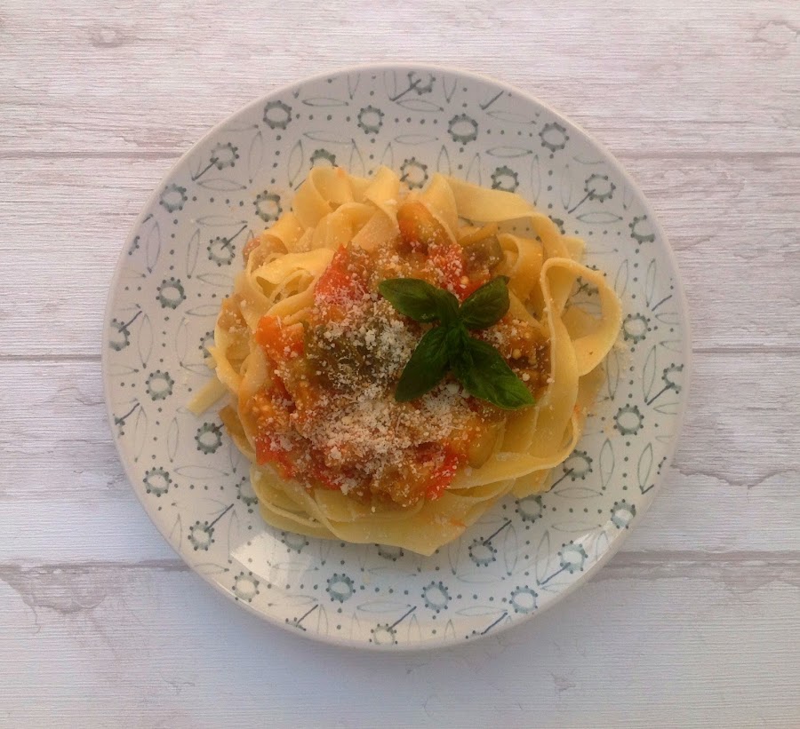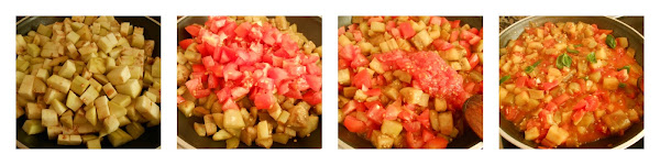 Pelamos y cortamos en cubitos la berenjena y el diente de ajo. Ponemos el aceite en una sartén y cocinamos allí la berenjena con el ajo, a fuego medio durante 5 minutos y cubriendo con tapa para que no se seque. Removemos de vez en cuando. Cortamos en cubitos dos tomates y los añadimos a la cocción de berenjenas, salpimentamos a gusto. Rallamos el tomate restante y lo agregamos. Dejamos cocinar durante 15 minutos. Por último añadimos la albahaca y apagamos el fuego.