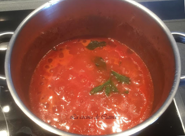 En una cazuela ponemos aceite y freímos el ajo, el tomate triturado y un tallo de albahaca, le ponemos sal, pimienta negra y una cucharadita de azúcar, removemos y cocemos a fuego lento durante 20 minutos. Añadimos un chorrito de vino blanco y dejamos cocer 5 minutos y en este momento rectificamos de sal y pimienta.