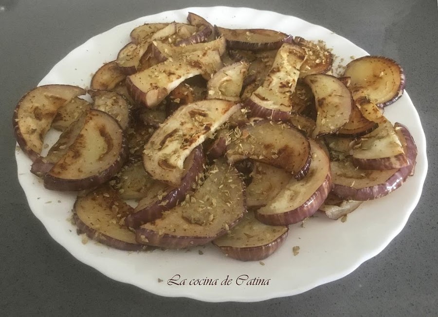 Lo primero que hacemos es lavar las berenjenas, las secamos y las cortamos longitudinalmente en cuartos. Si tienen el centro lleno de semillas, se las retiramos. A continuación cortamos las berenjenas a lo largo en tiras de un dedo. Ponemos a calentar una sartén con un poco de aceite y freímos las berenjenas en dos lotes, añadiendo un poco más de aceite si consideramos que hace falta (debemos procurar que no queden muy grasientas). Vamos removiendo las berenjenas de modo que todos los trozos se hagan por igual y las espolvoreamos con un poco de orégano seco (les dará un sabor fantástico). Las vamos moviendo de manera que todos los trozos se doren por todas partes. Cuando hayamos acabado con el primer lote, lo pasamos a un plato y repetimos el proceso con el segundo lote.
