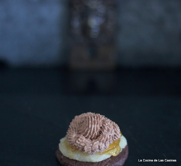 Seguimos con el mousse, deshaces el chocolate al baño maría con un poco de nata (crema de leche). Montas el resto e incorporas con movimientos envolventes cuando el chocolate esté templado. Introduce en la manga pastelera con la boquilla que más te guste, reserva en la nevera.