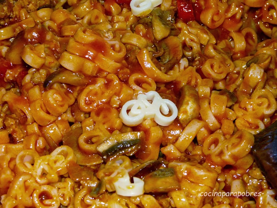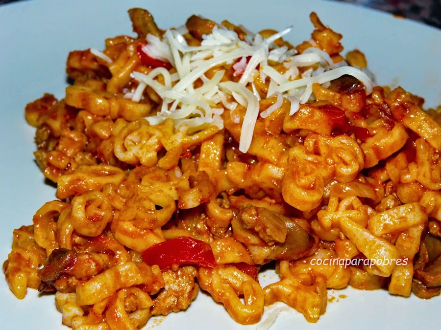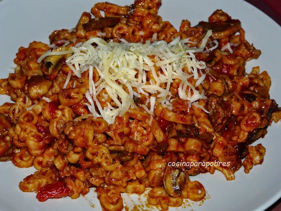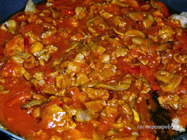 Cuando la carne cambie de color añadimos tomate frito, y dejamos unos minutos cocinando a fuego suave para que se integren los sabores, agregamos sal, orégano y mezclamos con la pasta.