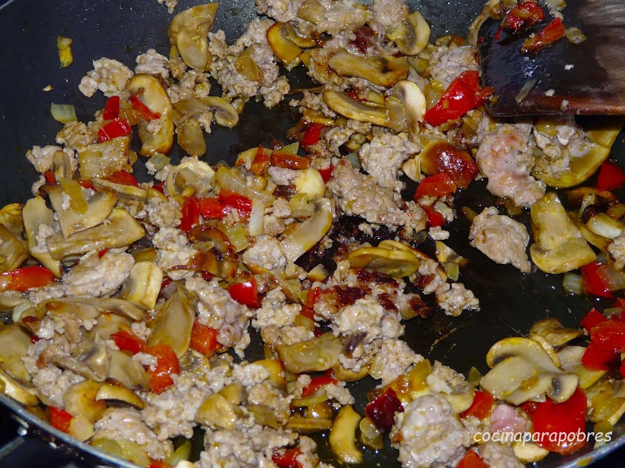 En una sartén con aceite ponemos la cebolla pelada y picada junto al pimiento troceado, cuando empiecen a hacerse incorporamos los champiñones mezclamos y dejamos un par de minutos al fuego antes de agregar la carne picada a la sartén.