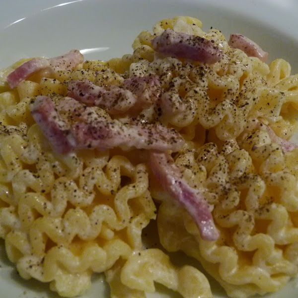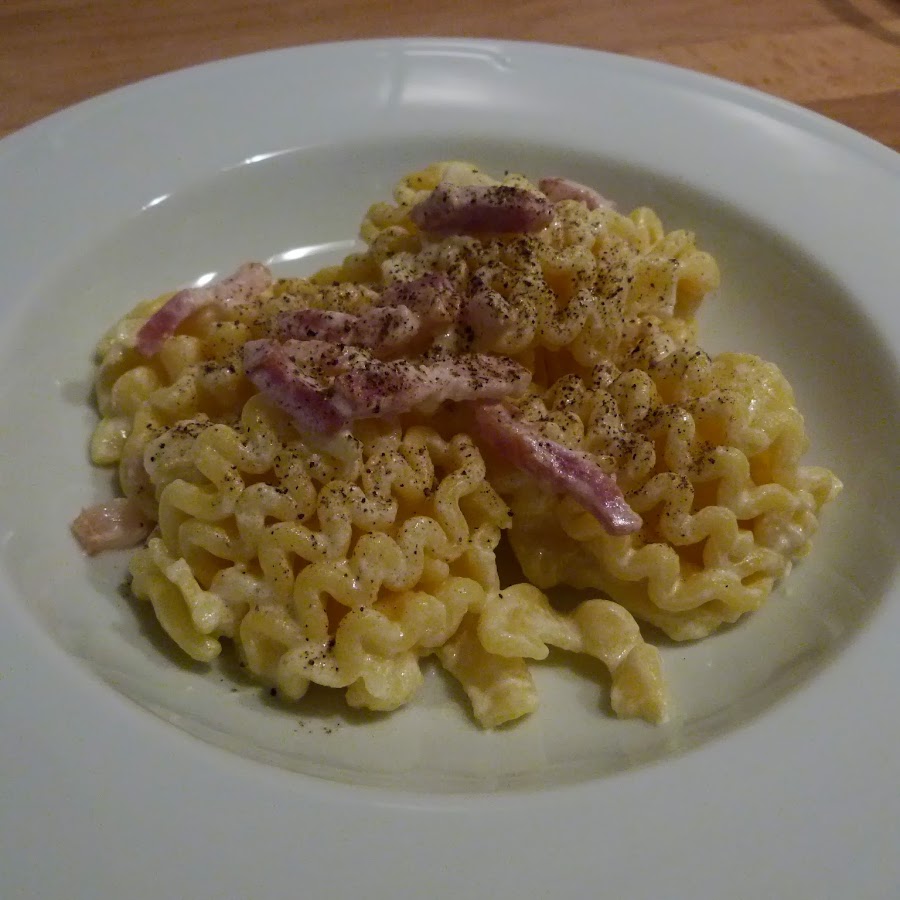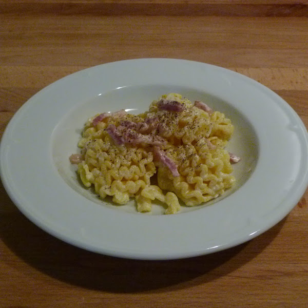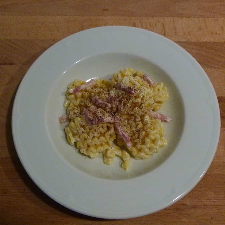 Dejamos que cueza de 2 a 3 minutos, y agregamos la pasta y los huevos, dándole vueltas para que estos no se hilen.