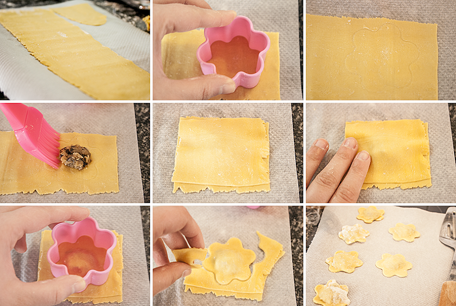 Extendemos la masa estirada sobre una tira de papel de horno, y hacemos una marca sin cortar con el cortador que hayamos elegido. Colocamos en el centro un poco de relleno, mojamos con agua los bordes y colocamos encima un trozo de pasta cuadrado que cubra el trozo de abajo. Presionamos con los dedos para evitar formar burbujas de aire y cortamos con el cortador. Llevamos a otra tira de papel de horno y dejamos que se seque. Repetimos la misma operación hasta terminar el relleno.
