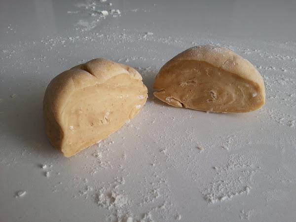 5. - Pasado el tiempo, cortamos la masa en 2, si hacéis más cantidad, cortáis en pequeñas porciones, como unos 60-80 gramos.