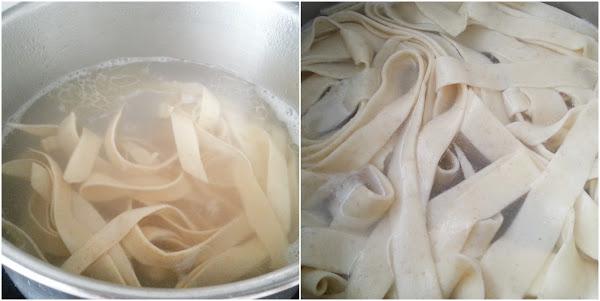 9. - Mientras, con un cuchillo largo y fino, vamos cogiendo la pasta, y la introducimos en el agua hirviendo.