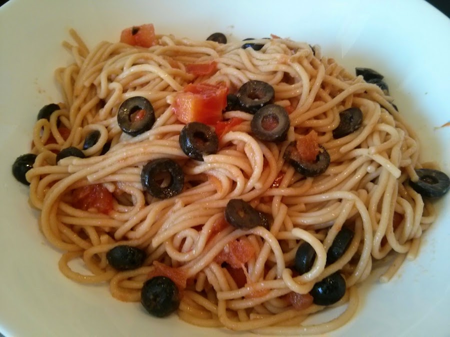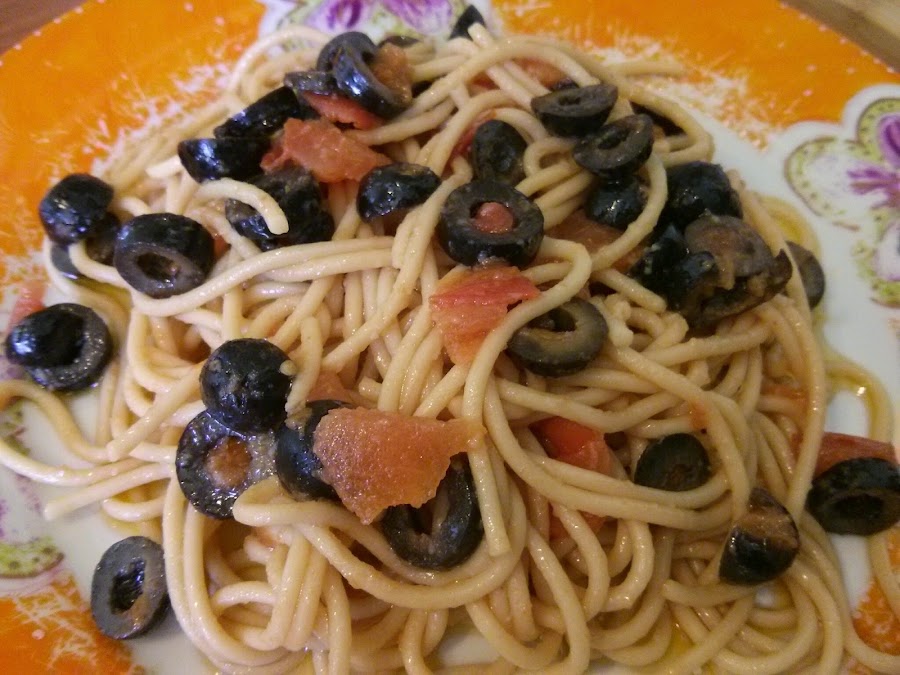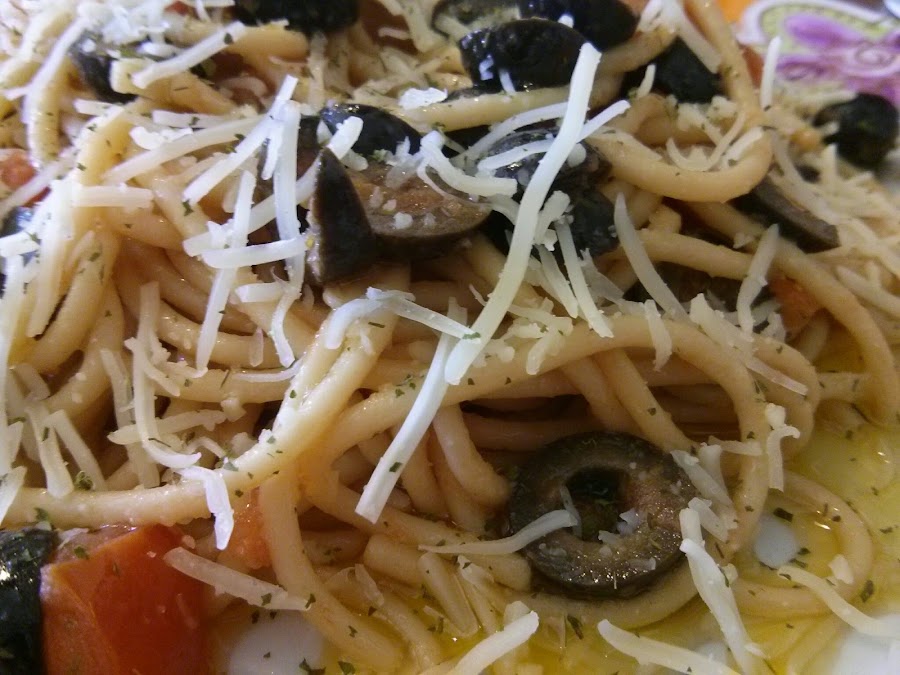 - Cocer la pasta, escurrir y mezclar con el sofrito de olivas, servir espolvoreando queso y perejil.