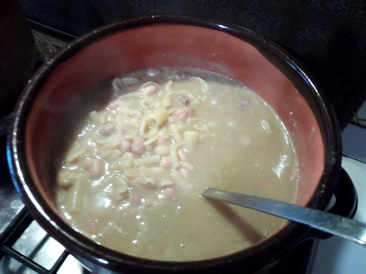 Se pueden usar también alubias en lata ya cocidas, si no hay tiempo para preparar alubias secas, en este caso, yo preparé las alubias secas, poniendo a remojo la noche anterior. Al día siguiente, en una olla de barro, poner a hervir durante una hora y media aprox con las verduras. La característica de la preparación de éste plato, es cocer la pasta en la misma agua de cocción de las alubias, para que todo coja sabor. Una vez que las alubias estén cocidas, en otra olla, siempre de barro, preparar un fundo con ajo, chalote, tomillo y romero y aceite (igual queda bien algo de picante). Agregar el chorizo o la salchicha desmigada y dorar.