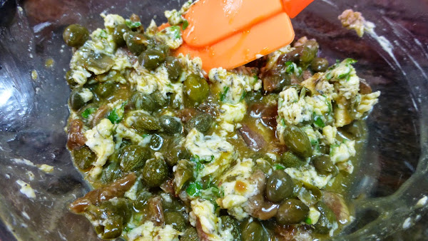 Mientras cuece la pasta preparamos la salsa. Ponemos en un bol la yema del huevo, las anchoas cortadas en trocitos, el tomillo, la mantequilla, las alcaparras, el perejil y pimienta recién molida. Mezclaremos muy bien y esperaremos a que se cuezca la pasta.