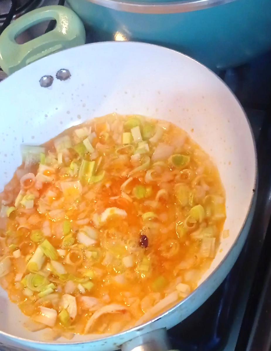 Picar la cebolla y los dientes de ajo y rehogar en una olla o sartén con el aceite, agregar sal ( y pimentón, y el puerro cortado.