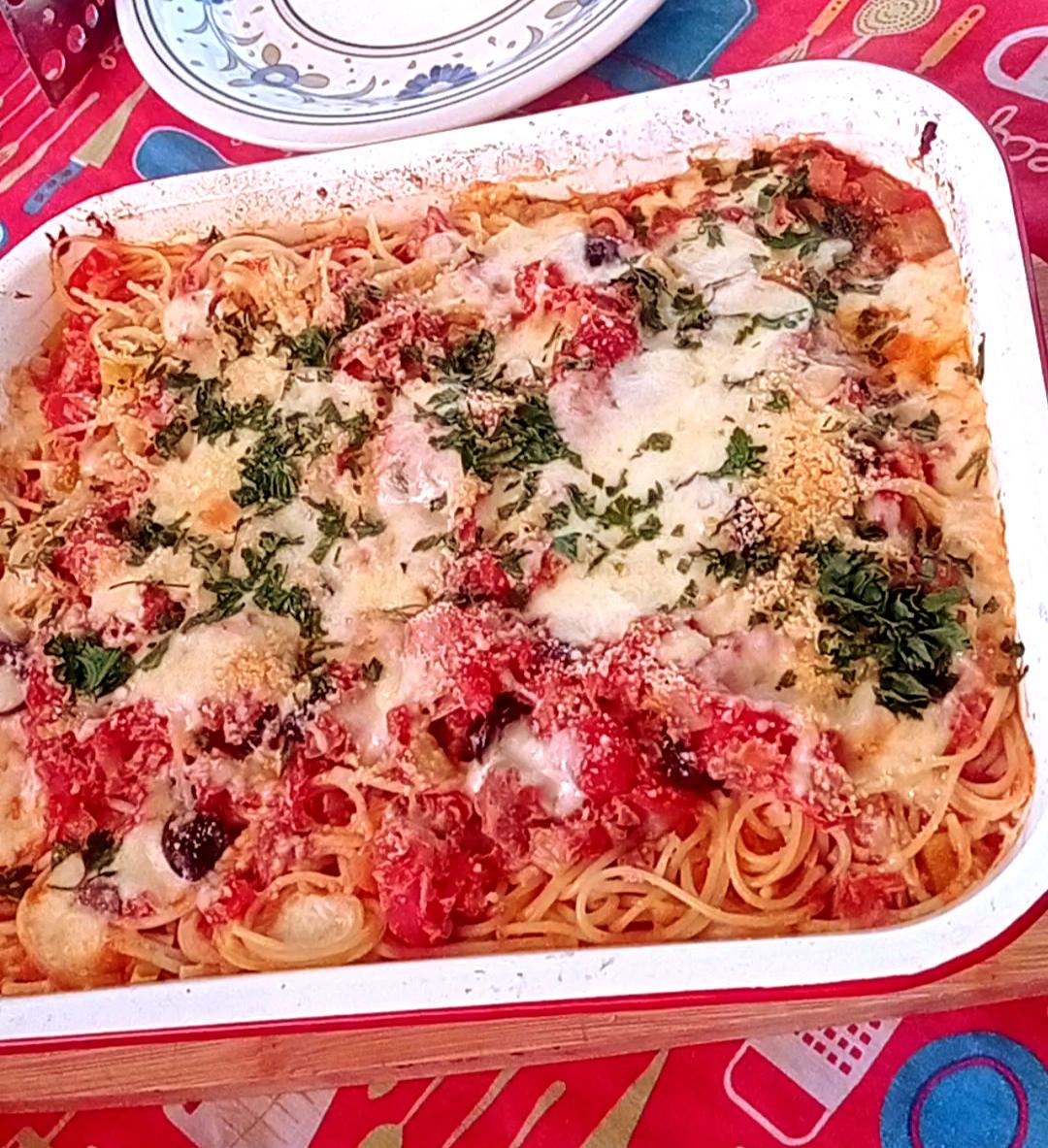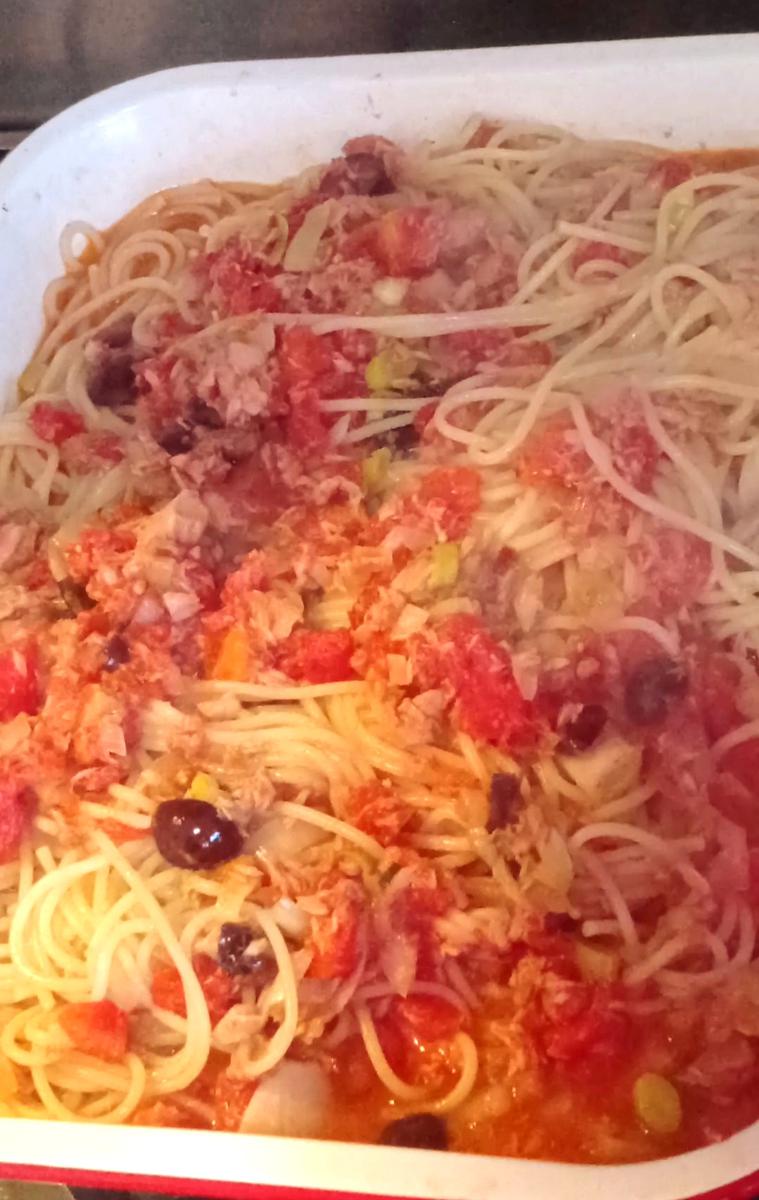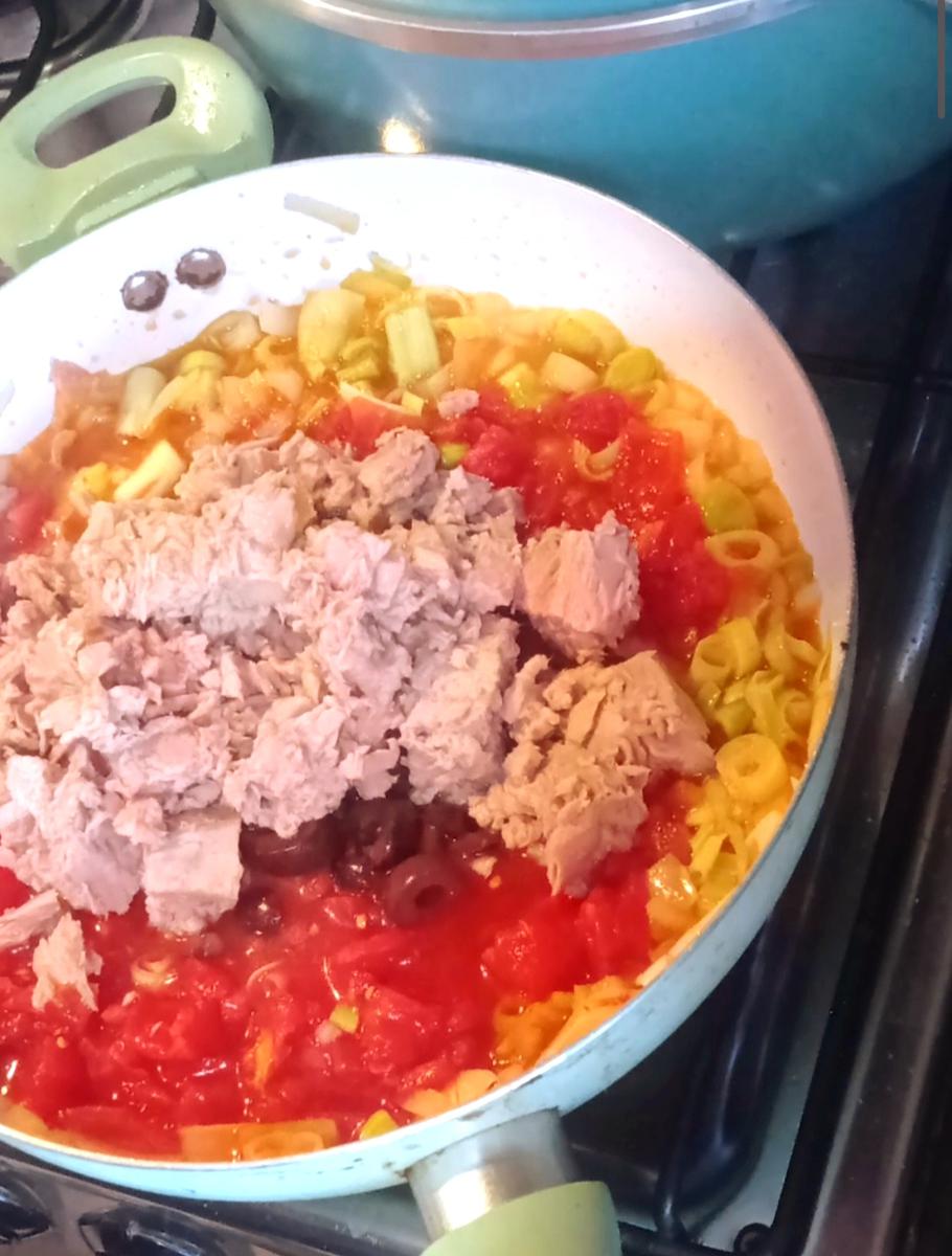 Añadir las aceitunas sin carozo, el tomate cubeteado, el atún escurrido y cocinar a fuego lento unos 10 minutos ( probar el sabor y rectificar con sal o condimentos a gusto).
