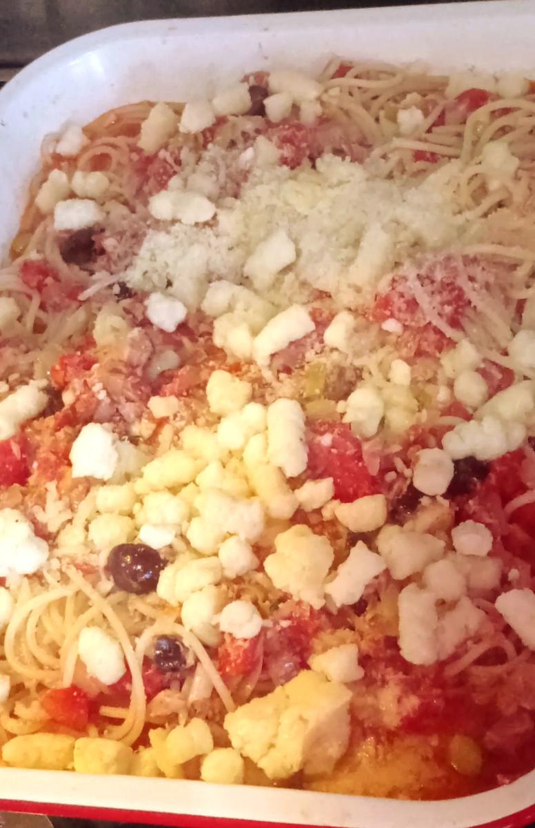 Cuando la pasta esté al dente, escurrir y volcar sobre la salsa, mezclar y distribuir en una fuente para horno.