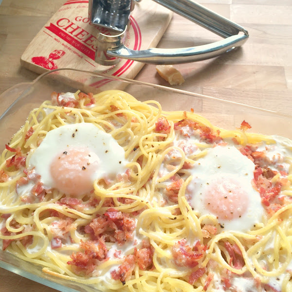 Se mete la fuente en el horno a 200 grados unos minutos (hasta que los huevos estén al gusto de cada uno). Yo los dejé con la yema cruda para que al mezclar con la pasta estuviese muy jugosa.