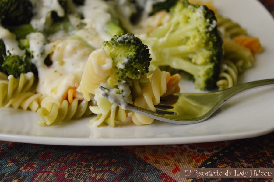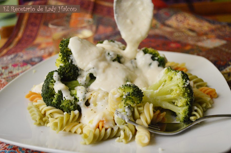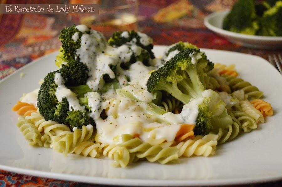 Ya solo queda escurrir la pasta, servirla en un plato junto con el brócoli y añadir por encima la bechamel al gusto. Puedes añadir un chorrito de aceite de oliva virgen extra y un poco de pimienta molida antes de servir.