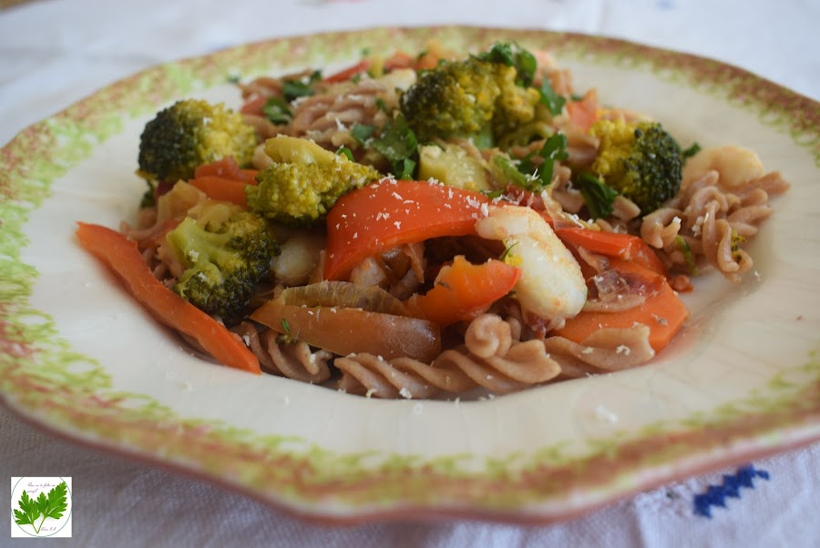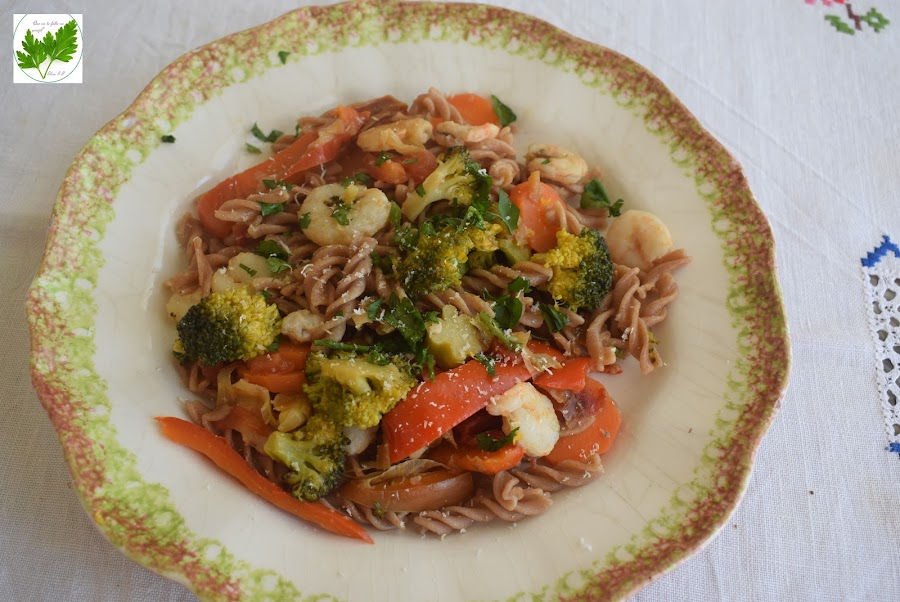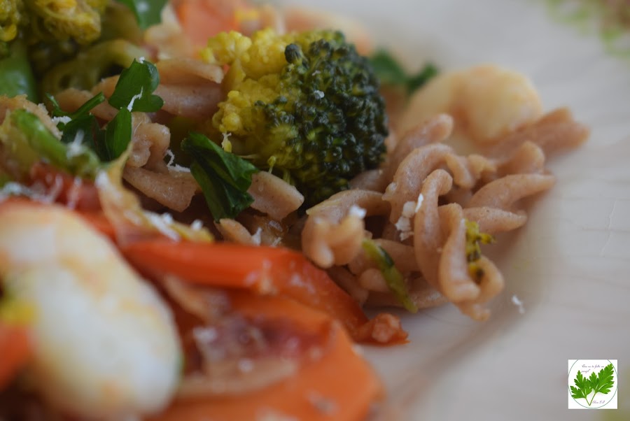 Cuando todo esté tierno ( pero no pasado, más bien al dente), echa la pasta y las gambas, remueve y espera a que se cocinen las gambas. Un par de minutos es suficiente. Retira del fuego. Añade el zumo del medio limón su ralladura, espolvorea el perejil fresco picado. Remueve para que todos los sabores queden integrados y sirve con el queso rallado por encima.