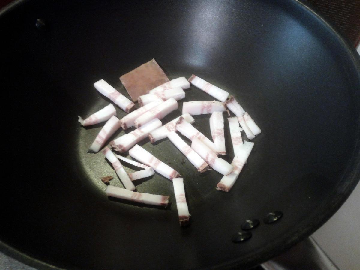 Poner la olla con el agua a hervir (consejos de cocción). En una sartén, poner la panceta y encender el fuego, así que calentando, la grasa se derrita y deja la panceta crujiente.