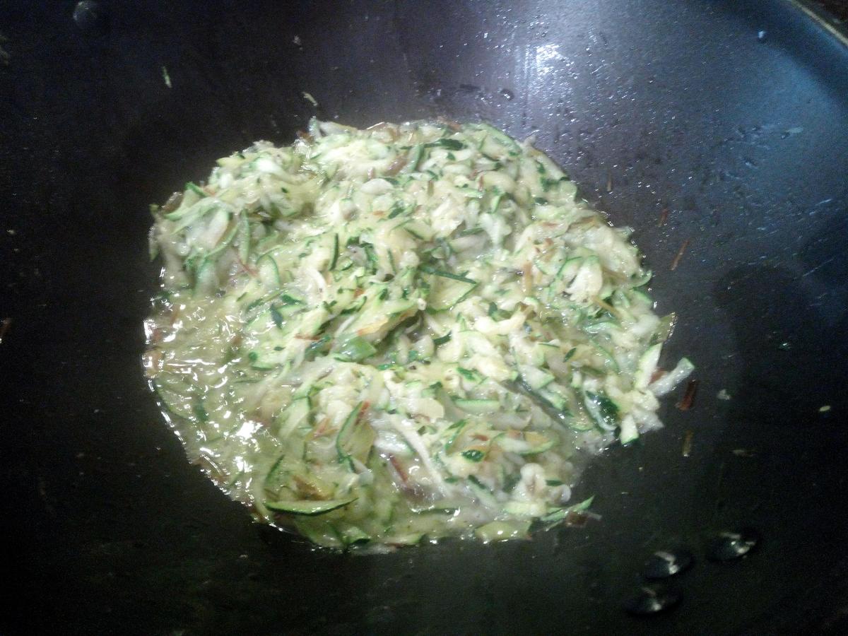 Una vez que la panceta esté crujiente y haya dejado la grasa en la sartén, retirar y agregar ajo tierno y chalote picado. Sofreír unos instantes e incorporar el calabacín rallado y tomillo fresco.