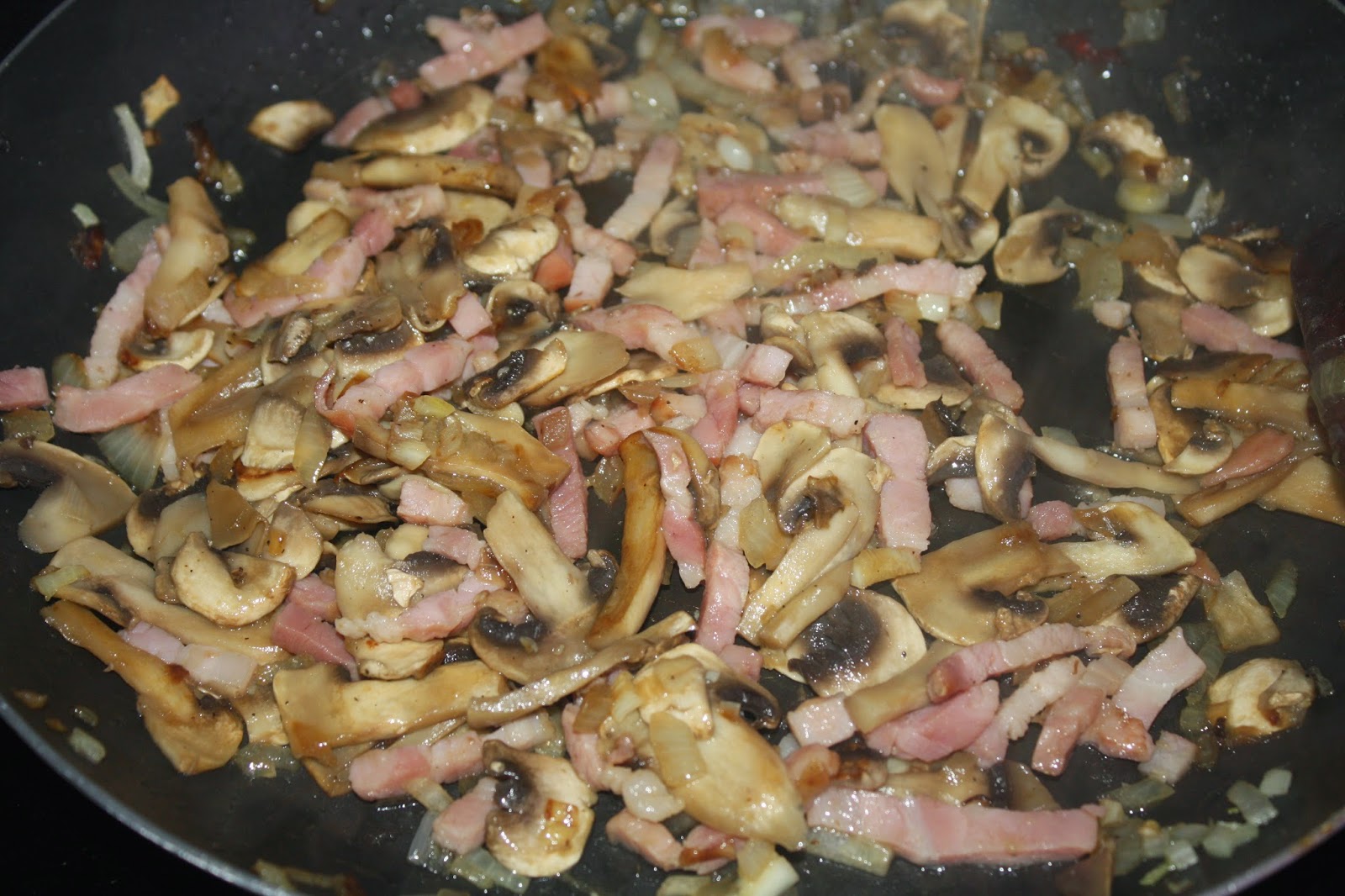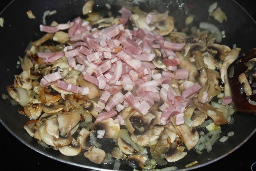 Una vez la cebolla esté casi dorada, sumamos a la sartén el bacon en tiras o dado, como mas nos guste; mezclamos bien y dejamos hasta que esté hecho el bacón.