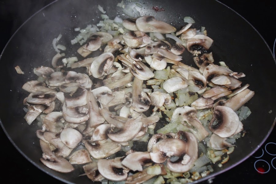 tomate fritoEn una sarté con un poco de aceite pondremos a dorar la cebolla muy picada, pasados unos minutos incorporamos los champiñones.