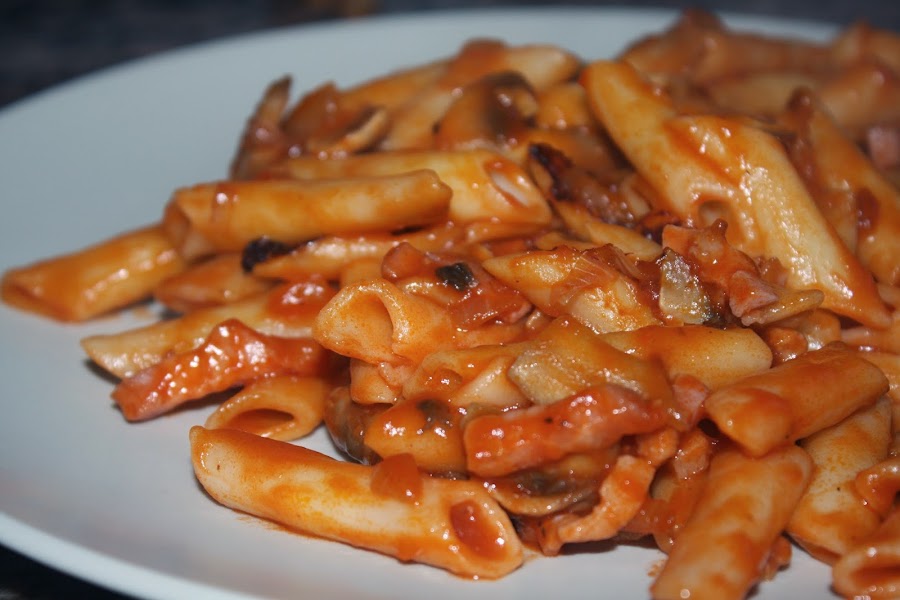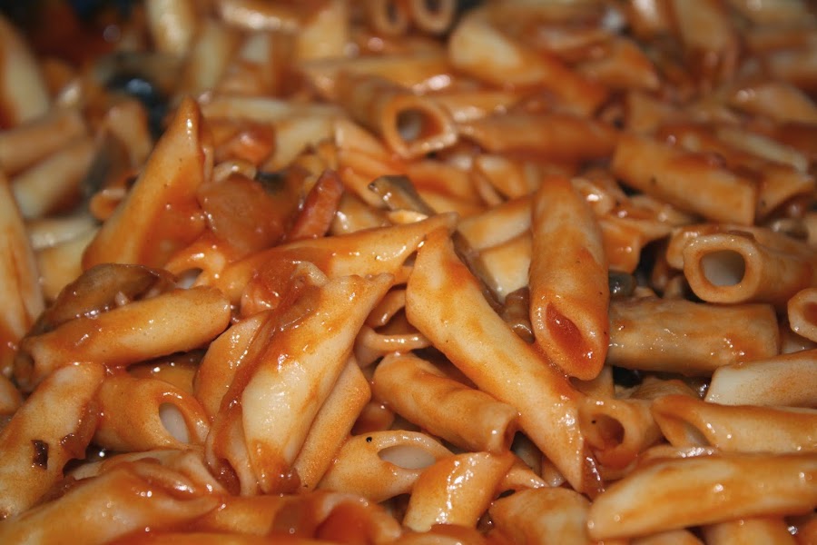 Por último incorporamos tomate frito a la sartén, mezclamos con el sofrito y los macarrones.