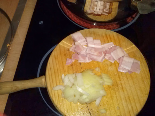 Se reservan los champiñones, y se frie el bacon en tiritas. Se reserva tambien. Se frie la cebolla y se añaden los tomates pelados y cortados en daditos o se añaden cuatro cucharadas de tomate triturado. Se sofrie todo junto unos minutos y se añade el bacon y los champiñones, se mezcla todo y se salpimenta.