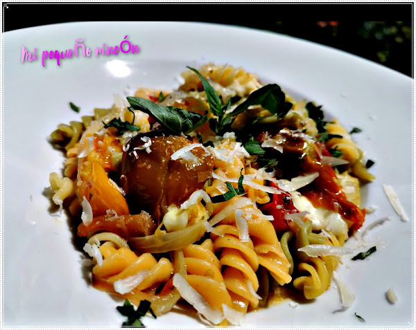 Cocemos nuestra pasta hasta tenerla al dente y sin escurrir la mezclamos con los tomates, la cebolla y las hojas de albahaca y volvemos a meter en el horno 8 minutos mas o menos y pasado ese tiempo probamos de sabor y rectificamos a nuestro gusto para terminar ponemos el queso mozzarella en daditos y acabamos en el horno unos 5 minutos mas.