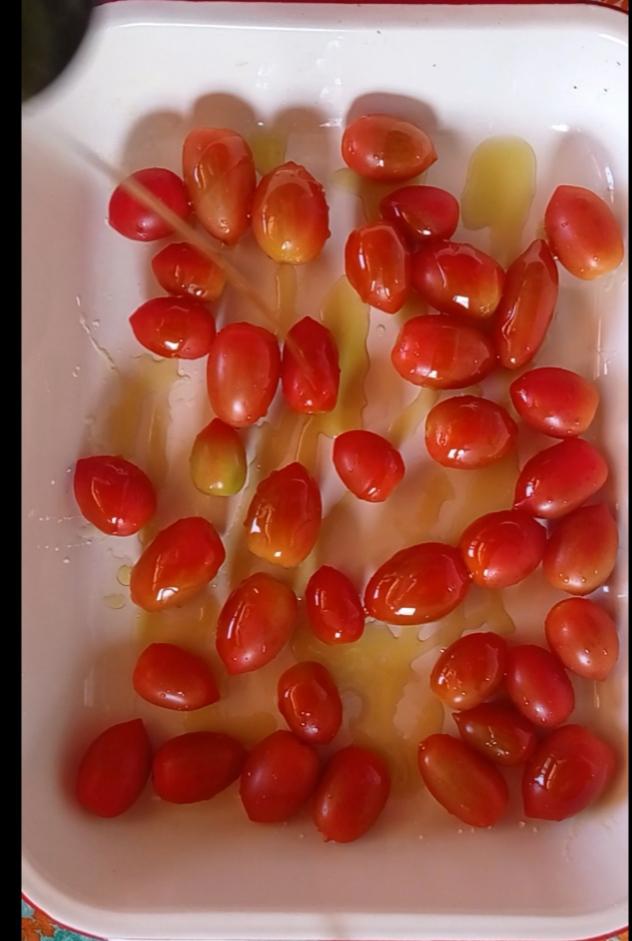 Lavar los cherry y acomodar en una fuente para horno, cubrir con aceite de oliva para impregnarlos bien y agregar sal, pimienta y pimentón y mezclar bien