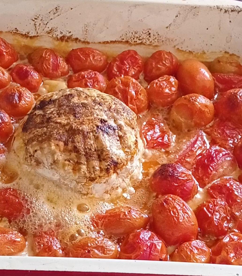 Cuando los tomates estén cocidos retira del horno y mezcla con el queso camembert y la albahaca, la cáscara del camembert también se va a ablandar, e integrar.
