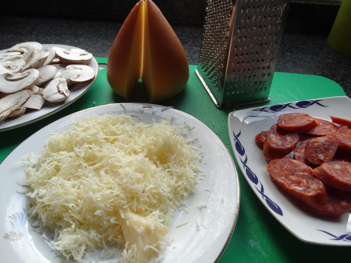 Lo primero que haremos será cortar en lonchas finas el chorizo, rayar el queso, y poner a cocer la pasta en agua hirviendo con sal (una cucharada sopera por litro) el tiempo que indica el fabricante.