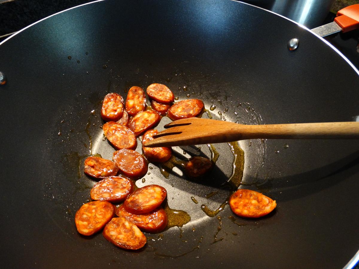 Mientras tanto ponemos un poquito de aceite a calentar en la cazuela y añadimos el chorizo.