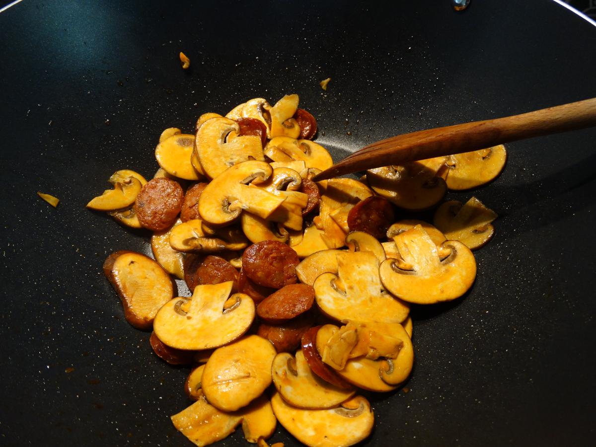 Cuando comience a soltar la grasa incorporamos los champiñones.