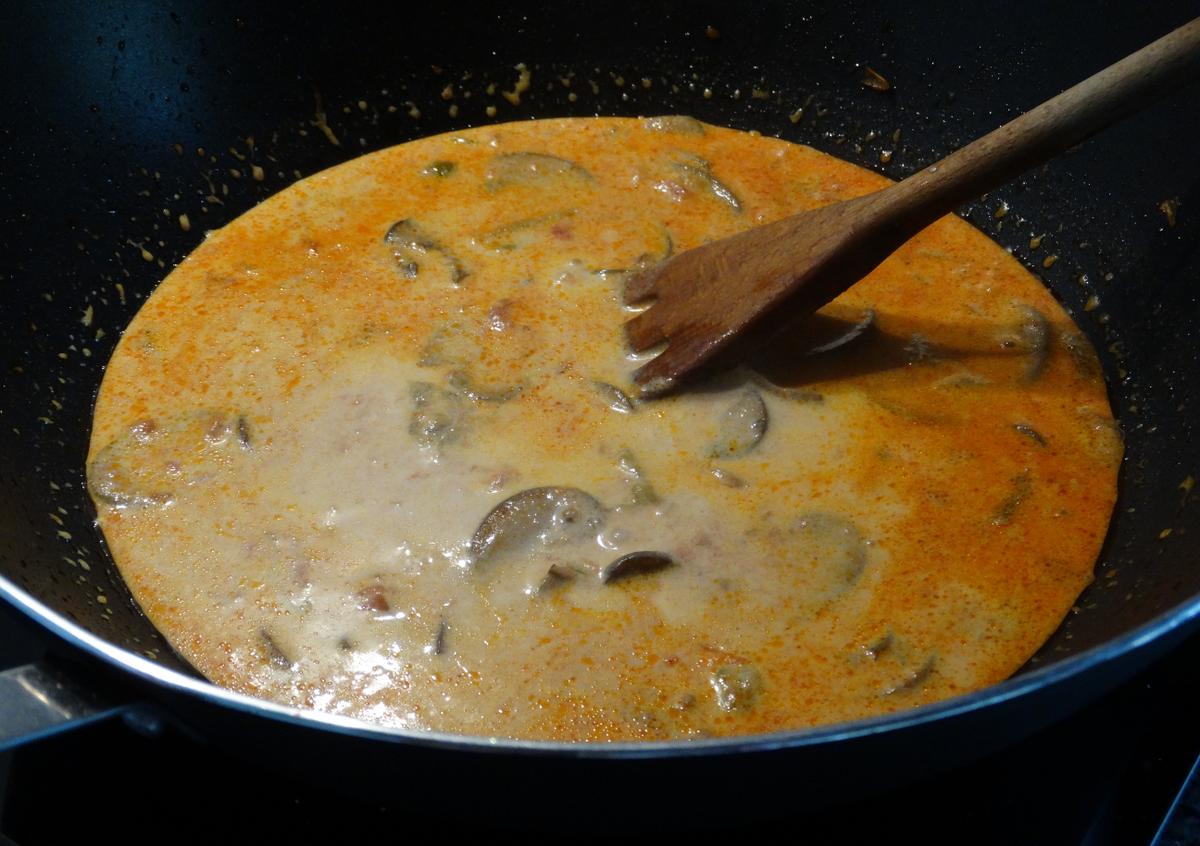 Cocinamos unos minutos y añadimos la leche evaporada y un poco de nuestro queso rayado.