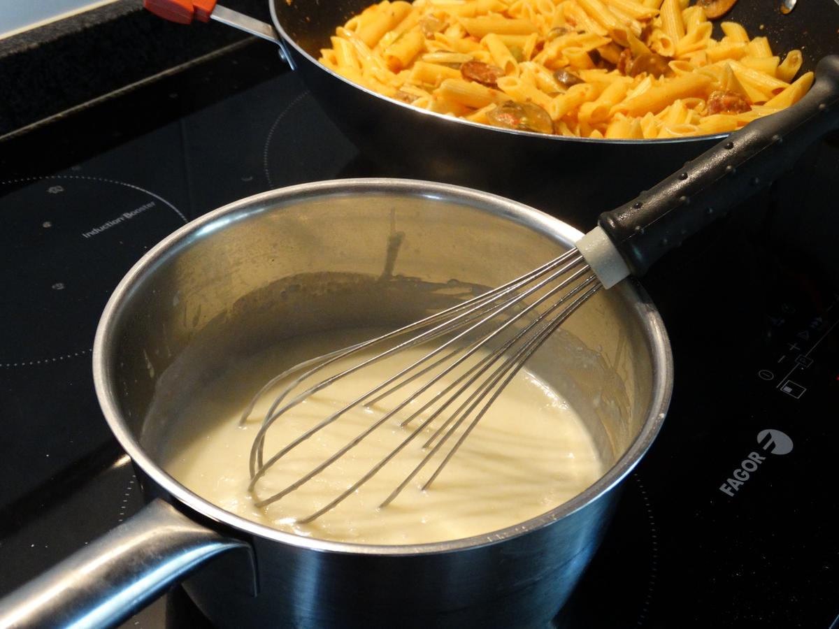 Preparamos la bechamel con casi medio litro de leche, dos cucharadas soperas de aceite de oliva, tres cucharadas de harina, una pizca de sal y nuez moscada al gusto.