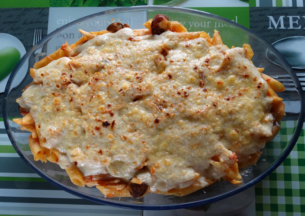 Pasamos la pasta a una fuente apta para el horno, la cubrimos con la bechamel y espolvoreamos con el queso rayado. Gratinamos y ya la tendremos lista para servir.