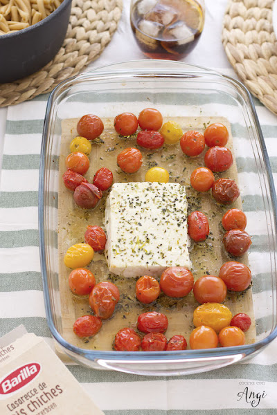 Ya en su día, hace un mes, me animé con esta receta que se hizo viral gracias a TikTok y a las miles de personas, que como yo, cocinamos y compartimos nuestras preparaciones en Instagram. Pasta con queso feta y tomates cherry al horno, o mejor dicho falsa pasta. En esta justa ocasión he utilizado pasta hecha con harina de garbanzo íntegramente.