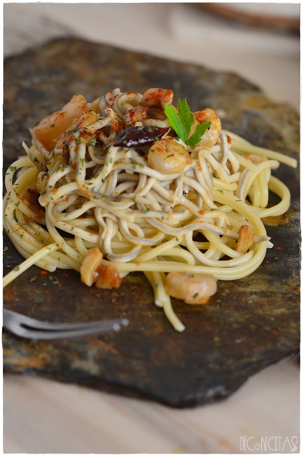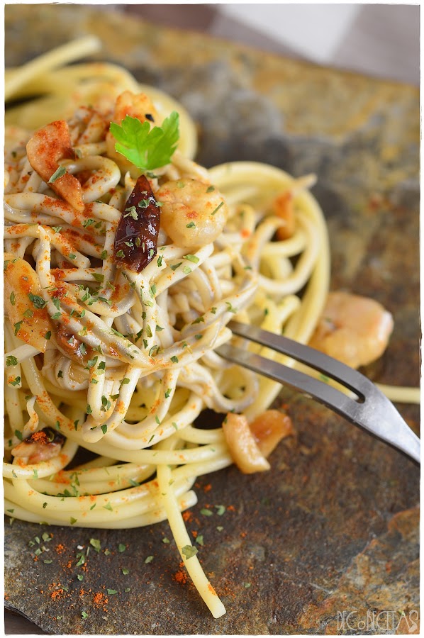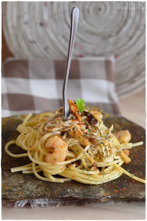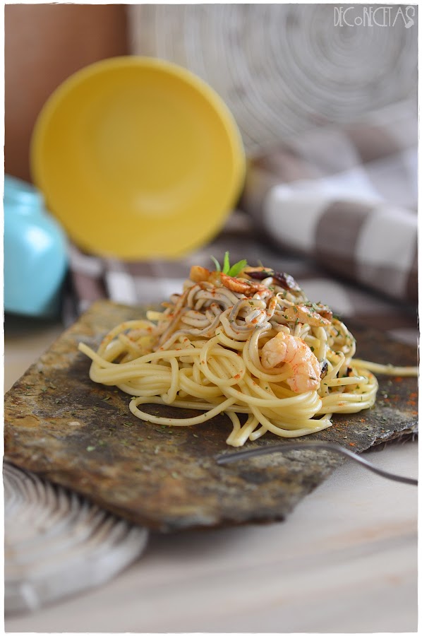 Doramos un par de ajos con un par de guindillas en una sartén, agregamos las angulas sucedáneas y gambas y salteamos. Cuando estén listas, agregamos los espaguetis, salpimentamos y a comer!!