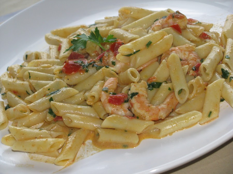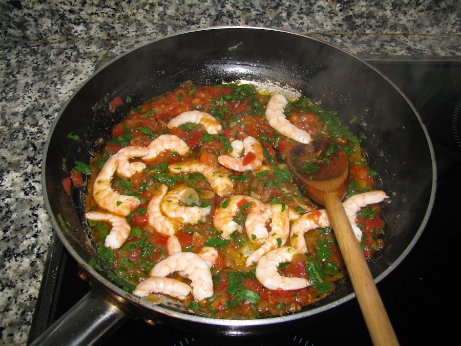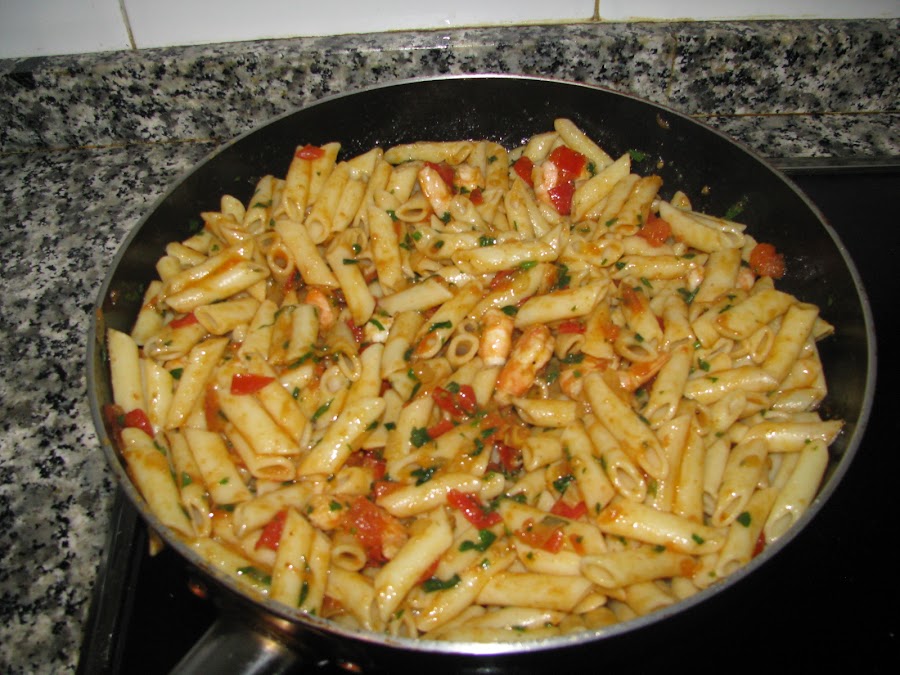 A continuación vamos incorporando los dientes de ajo en láminas, el tomate cortadito en taquitos, dejamos cocinar un poco y después ponemos los langostinos cocidos o frescos pelados. Rehogamos bien y echamos el curry en polvo. Volvemos a rehogar un poco y por último le añadimos los macarrones ya cocidos y el vaso de leche. Dejamos cocer una par de minutos y listo....