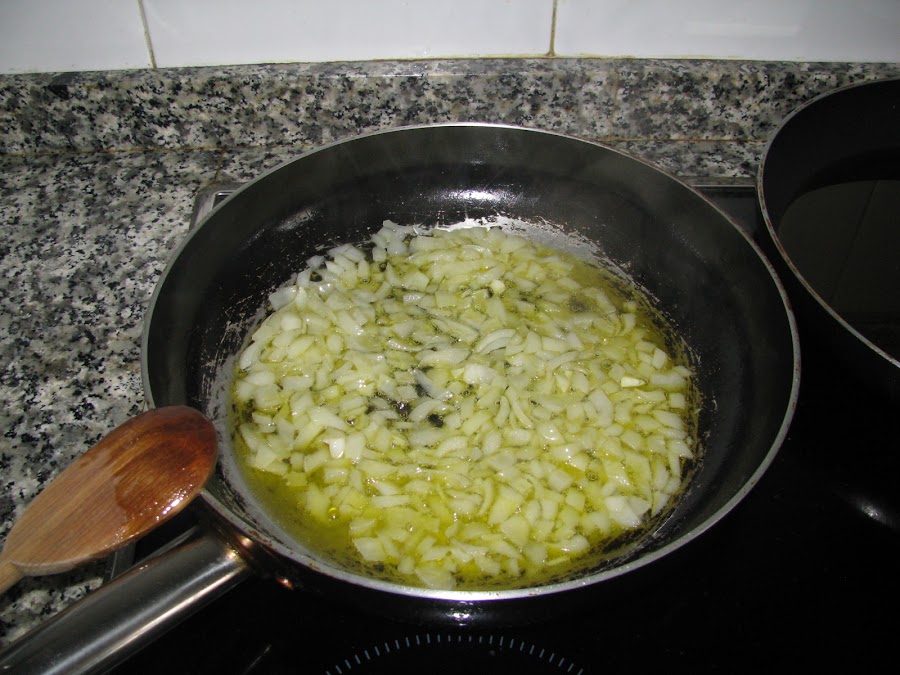 Pochamos la cebolla tranquilamente con un poco de aceite de oliva o si queréis con un poco de mantequilla.