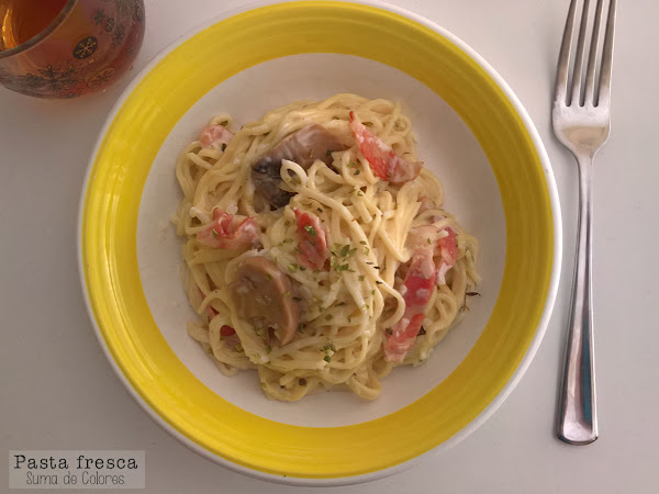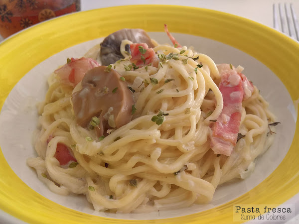 Muchas personas identifican este tipo de recetas que llevan nata (crema de leche) con la pasta carbonara, pero la pasta carbonara se realiza con huevo, no con nata (crema de leche) (ya publicaré en otra ocasión la receta en el blog).