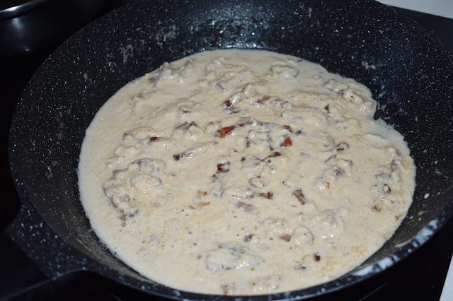 Ahora añade unas cucharadas de agua de la cocción de los macarrones a la nata (crema de leche).