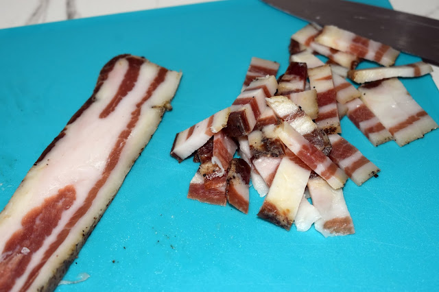 Cortar a tiras la panceta a la pimienta.