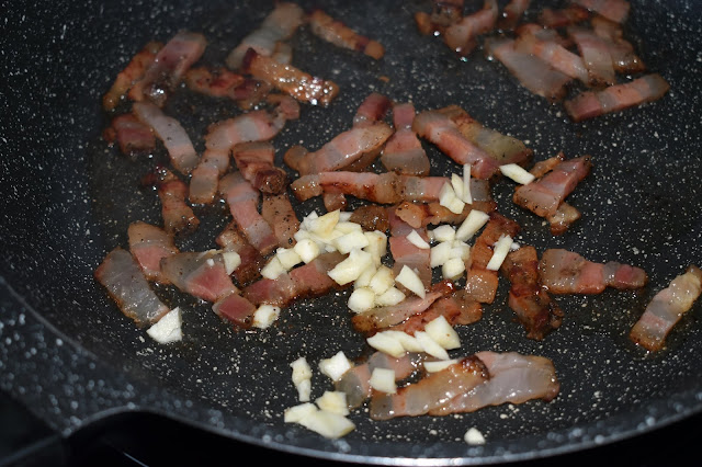 Pela el diente de ajo y corta a trozos pequeños, añade a la sartén.
