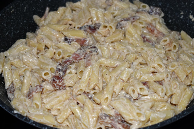 Escurre los macarrones y ponlos en la sartén y remuévelos bien para que se mezclen con la salsa de nata (crema de leche).