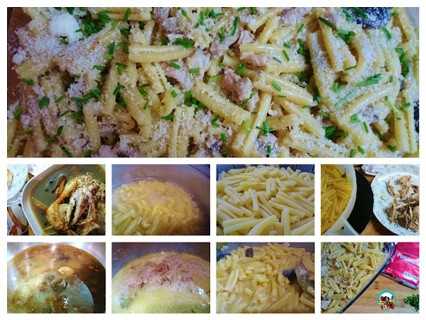 3.-La salsa que nos ha sobrado del asado la ponemos a calentar con un vaso de nata (crema de leche) liquida en un caldero chato y grande. La llevamos a ebullición y añadimos la pasta. Cocinamos 2 o 3 minutos más, removiendo de vez en cuando para que no pegue. Servimos la pasta con un poco de queso parmesano en polvo por encima y un poco de cebollino fresco o perejil fresco picado.