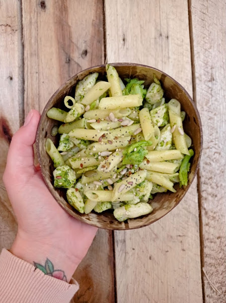 Mezclamos con la pasta cocida y ya tenemos nuestra comida lista! Podéis agregar por encima un puñadito de semillas, es opcional, yo le puse al mio al de Adrián no.